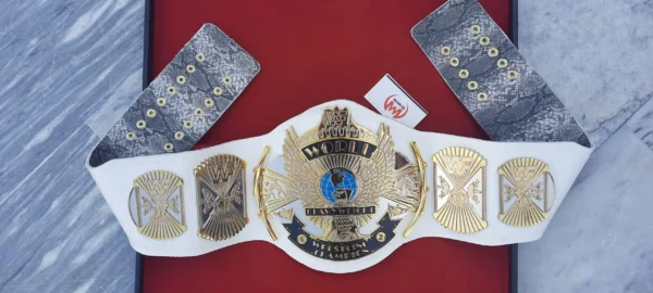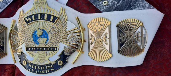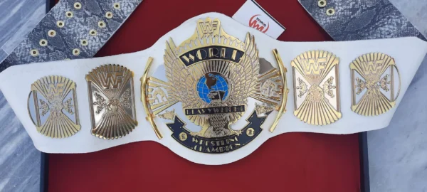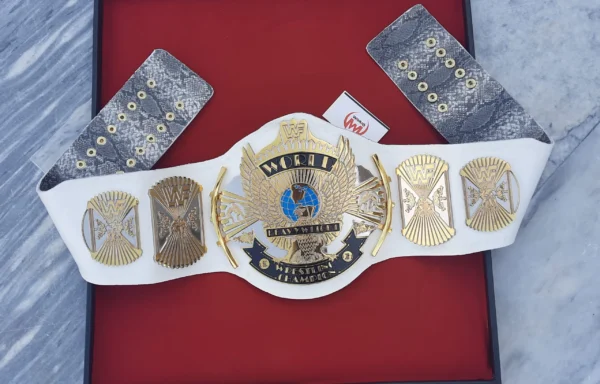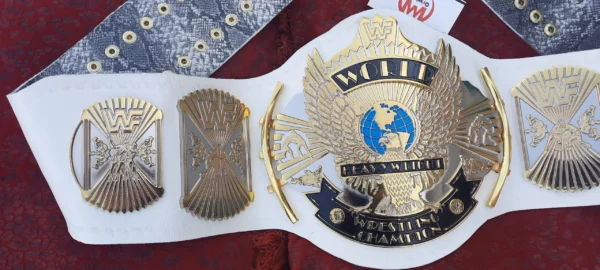 Shop this Vintage Title for Collectors, The WWF Winged Eagle Belt Dual Plated Championship Replica Title for Sale. Zinc alloy 5.5mm Thick Dual Plates, 2.5mm Deep CNC Milling 3D Engraving Approx. Gold & Nickle Plating, Genuine Handmade Tooled Leather Strap. Best buy for Old School Era Wrestlers, Wrestling Collector Belt!